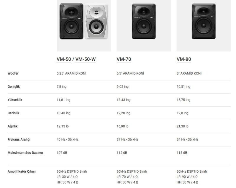 Her VM serisi hoparlör, geniş bant ses üretimini sağlamak için 96 kHz örnekleme DSP’si olan bir D Sınıfı amplifikatörle donatılmıştır. Yüksek verimli performansı, düşük distorsiyon oranı, yüksek enerjili sesin oluşmasını sağlar. 4 mm kalınlığındaki sert alüminyum ön bölme, rezonans ve titreşimleri daha da bastırarak orijinal kaynağa özgü bir ses sunar. Aramid fiber woofer konileri, bas ve düşük-orta frekanslarda hissedeceğiniz olağanüstü bir güç sağlar. Yeni geliştirilen bu koniler, geleneksel kağıt astarlı Aramid konilerden yüzde 30 daha hafiftir ve bu da onları daha derin sesle daha güçlü hale getirir. Vortex Bass Accelerator, düşük kaliteli sesin sıkı olmasını ve istenmeyen titreşimlerden uzak olmasını sağlar, çünkü bas refleks bağlantı noktasındaki çubuklar, saf ses sunmak için havanın hoparlörden serbestçe akması anlamına gelir. Her açıdan detaylı tasarımı ile yeni Pioneer Dj VM serisi size kalite ve güç vadediyor…
